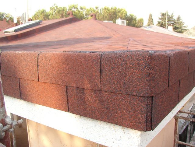 Suministro y colocación de placa asfáltica con armadura de fieltro de fibra de vidrio de 110 gr/m2, recubierta con mástico bituminoso de gran resistencia a la temperatura y protegida en su cara externa con gránulos minerales de pizarra y con acabado de arena fina como material antiadherente en su cara interna. Esta placa va fijada mediante clavos de acero al hormigón y soldadas las hojas entre sí.