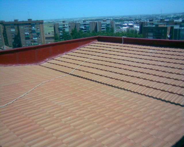 Retirada de las tejas existentes en cubierta a contenedor.Limpieza de mortero bajo teja. Repaso de los paramentos verticales, picando las zonas que se encuentren en mal estado y enfoscándolo. Sustitución de canalones. Instalación de una lámina de oxiasfalto y superficie autoprotegida con gránulos minerales de pizarra, con masa nominal de 4 Kg/m2, y armado con fibra de poliéster a la cubierta. Colocación de nuevas tejas. mediante una lámina asfáltica con terminación en aluminio gofrado, soldada a fuego con la superficie, envolviendo la piedra o a modo de vierteaguas.