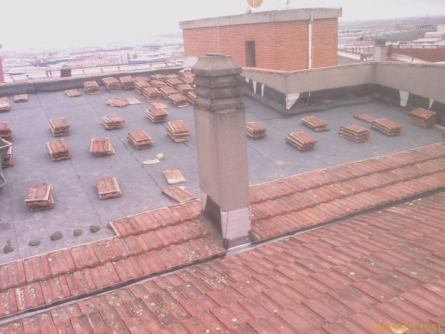 Retirada de tejas existentes, intentando aprovechar las que se encuentren en mejor estado. Cambio de canalones de cubierta. Colocación de rasillón sobre tabiques para la aplicación de mortero con mallazo. Aplicación de mortero de cemento y arena de río. Cuando el mortero haya secado procedemos a la aplicación de una imprimación asfáltica para conseguir mayor agarre de las láminas impermeabilizantes, impermeabilización con dos telas asfálticas. Reposición de tejas aprovechando las que se hayan conservado del antiguo tejado y suministrando nuevo material. Impermeabilizacion de petos y chimeneas. Suministro y colocación de nueva claraboya en caso de que se considere necesario.