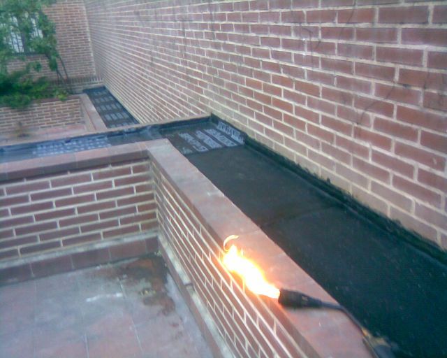 Retirada de las tierras, que cubren la jardinera para poder impermeabilizarlas. Aplicación de una imprimación asfáltica, para conseguir mayor adherencia de las láminas asfálticas a la superficie. Colocación de dos láminas asfálticas adheridas mediante soplete y solapadas entre sí. Solado de la zona que anteriormente ocupaban las tierras.